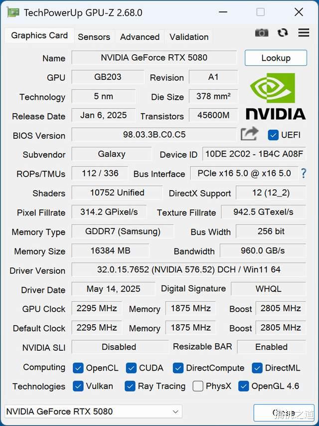 显卡规格方面,这张影驰 名人堂 GeForce RTX 5080 HOF OC LAB Deluxe-X显卡采用了GB203-400核心,拥有10752个CUDA处理器,核心加速频率相较其他显卡高了不少,其显存也升级为GDDR7,显存频率飙升至30Gbps,数据传输速率进一步提升。