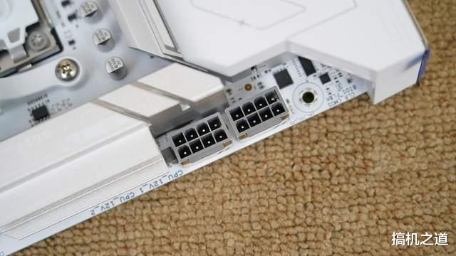 主板采用了非常扎实的白色VRM散热装甲,颜值和散热效果俱佳。主板I/O装甲的ROG LOGO支持ARGB灯效,效果非常不错,同时也支持通过神光同步软件来自定义自己喜欢的灯效风格。