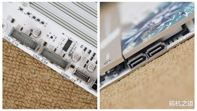 主板提供了2组USB 3.0前置接口和1个20Gbps USB 3.2 Type-C前置接口,并经过金属强化设计,耐用性更高,主板还提供了2个SATA 6Gbps接口。