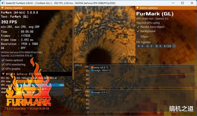 GPU烤机测试(室温同上),得益于显卡强悍的散热设计,配合机箱合理的风道,GPU的最高核心温度为64℃,也属于非常优秀的水平。