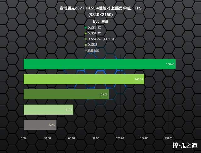 在《赛博朋克2077》测试中,开启DLSS 4后帧率得到了大幅度提升,其中4x档最强,3x档其次,2x档再次,和DLSS 3、DLSS 2比起来,帧率提升非常明显,和原生画质相比,提升的幅度就更夸张了。