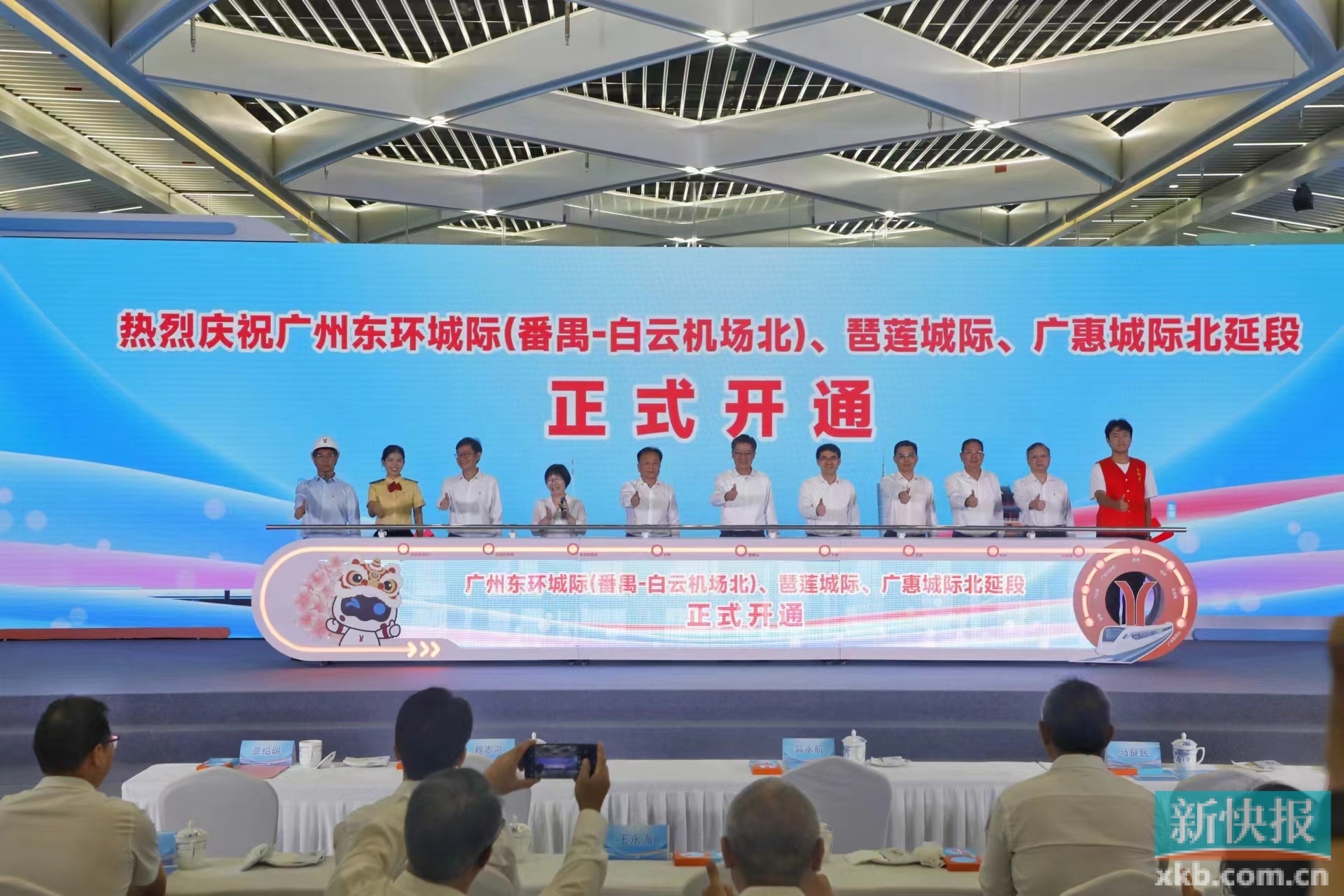 “5、4、3、2、1!开通!”9月29日上午,广州地铁集团在城际琶洲站举行“网连湾区粤进未来”开通活动。随着与会嘉宾共同推动开通杆,宣告广州东环城际(番禺﹣白云机场北)、琶莲城际和广惠城际北延段(小金口﹣惠州北)顺利开通。近200名建设者代表、市民代表共同体验了广州东环城际铁路首发列车。