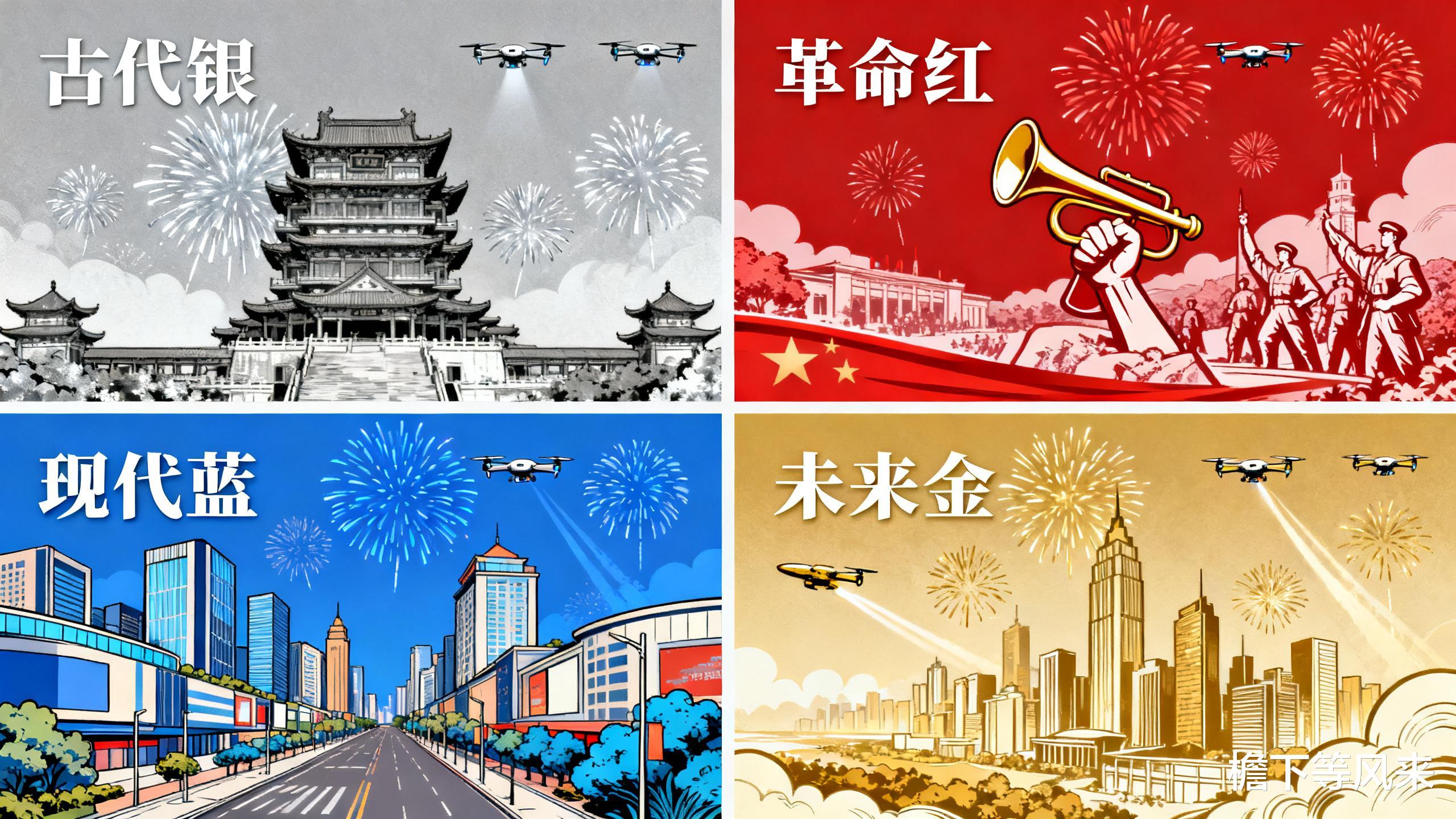 更有意思的是细节设计,“古代银、革命红、现代蓝、未来金”这四类色彩主题的烟花,各自对应四个不同篇章;