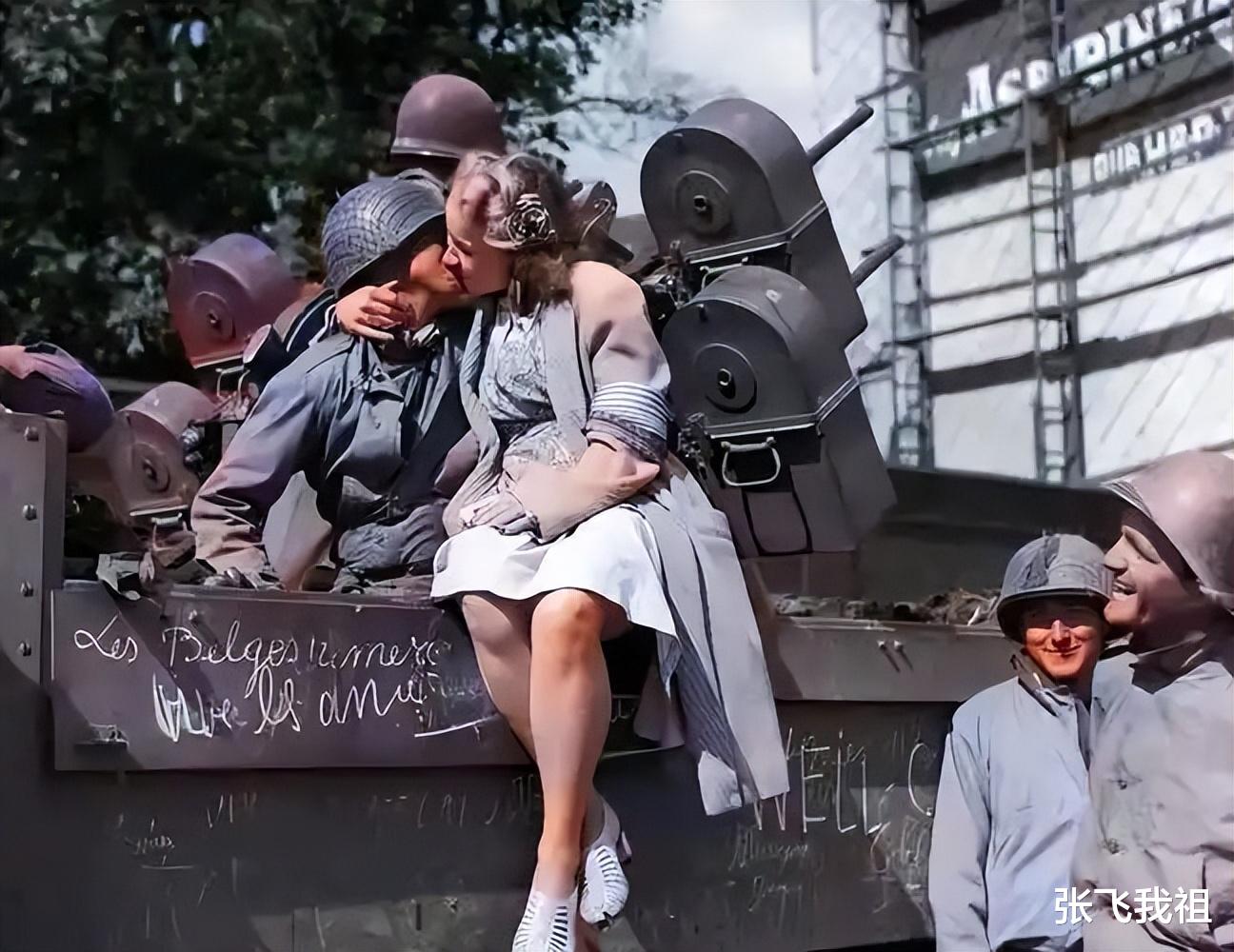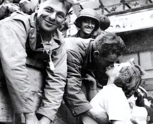 1944年,巴黎的解放让全世界为之欢呼。盟军的胜利标志着法西斯统治的崩溃,美军作为解放者,成为巴黎街头最受瞩目的存在。士兵们受到了鲜花和掌声的欢迎,媒体的镜头定格下无数“英雄归来”的画面,一张美国士兵与巴黎少女热吻的照片更是传遍全球