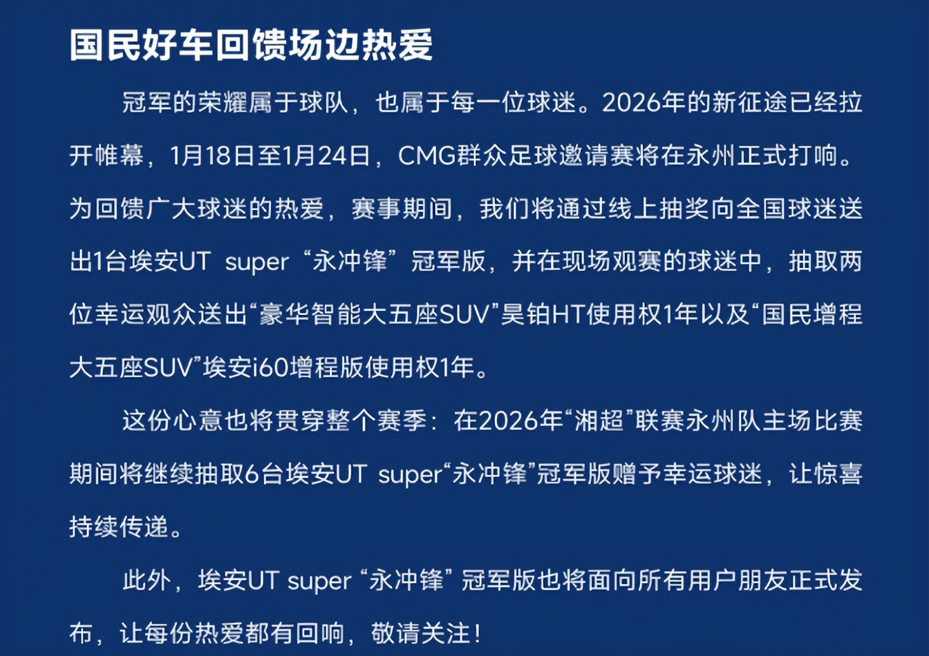球迷们的福利更是贯穿全年,惊喜不断!1 月 18 日至 24 日,CMG 群众足球邀请赛将在永州正式开赛,赛事期间,全国球迷都能参与线上抽奖,有机会把埃安UT super“永冲锋”冠军版直接开回家;到现场观赛的球迷运气更爆棚,会抽出两位幸运儿,分别获得 “豪华智能大五座 SUV” 昊铂 HT 和 “国民增程大五座 SUV” 埃安 i60 增程版的 1 年使用权。而且这份好运不会停,2026 年湘超联赛永州队的所有主场比赛中,还会陆续抽出 6 台同款冠军版汽车,让每一位支持球队的球迷都有机会收获惊喜。另外,这款备受关注的埃安UT super“永冲锋”冠军版也会正式面向所有用户发布,让更多人能拥有这份 “冠军同款”。