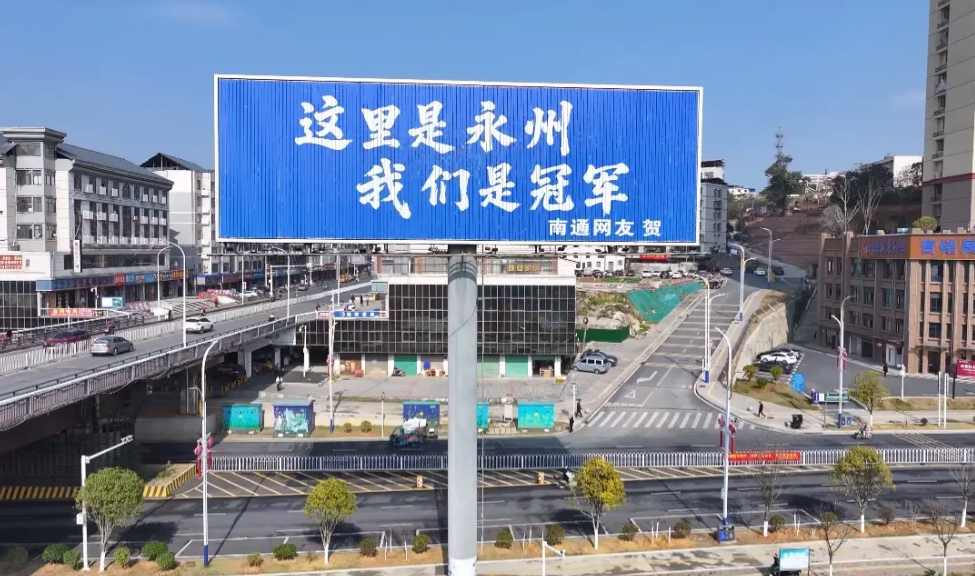 更让人破防的是,这份热爱从来都不是孤军奋战。永州队夺冠后,江苏苏州一位球迷自掏腰包,制作了大幅祝贺广告牌竖在永州队主场附近,用最朴素的方式为草根冠军喝彩。消息一传开来,江苏 “十三太保” 其他地级市的球迷纷纷响应,盐城、南京、泰州等多地的助威广告牌陆续亮相永州街头,跨省为体育呐喊的场面,成了这个冬天最暖的风景线。而广汽埃安的加入,让这份来自民间的热爱,多了国民品牌的坚实支撑,让 “湘超精神” 被更多人看见。