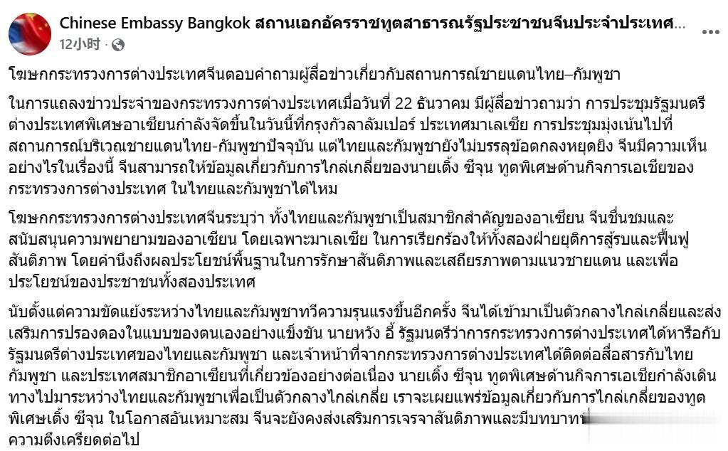 12月23日,中国驻泰国大使馆通过官方Facebook账号发布了一条消息,内容为中国外交部发言人回答记者关于泰柬边境局势的问题。