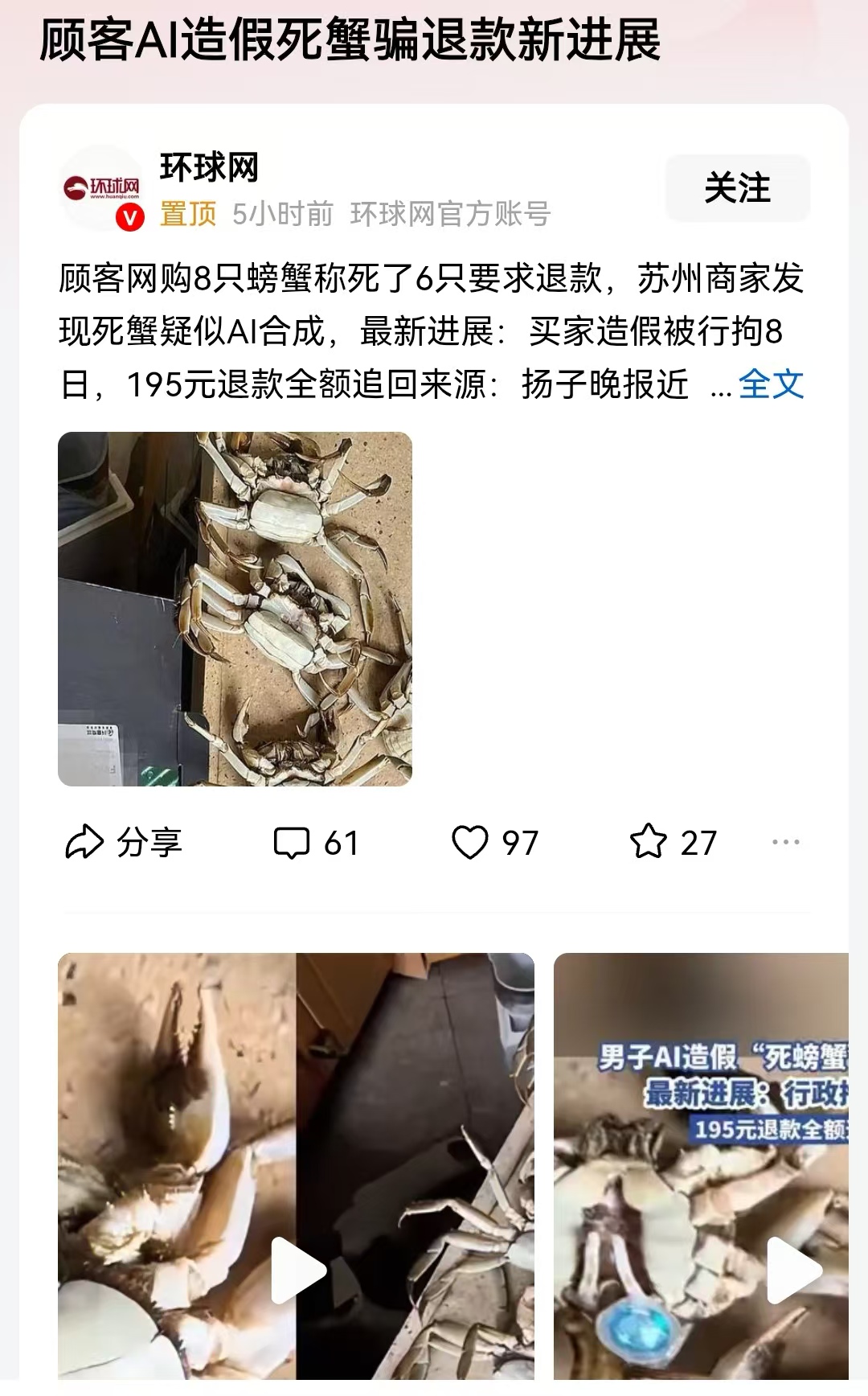 江苏苏州一商家卖大闸蟹,广州一位消费者网购了8只,但是后续联系商家,其中有照片和视频,说已经有6只是死的,要求退款。商家无奈退款,死螃蟹肯定也不需要退货回来了。不过之后商家仔细辨别发现,死蟹图片和视频疑似AI合成。于是一边向消费者当地警方报案,一边发律师函给消费者,要求对方承认造假行为,返回退款并道歉。