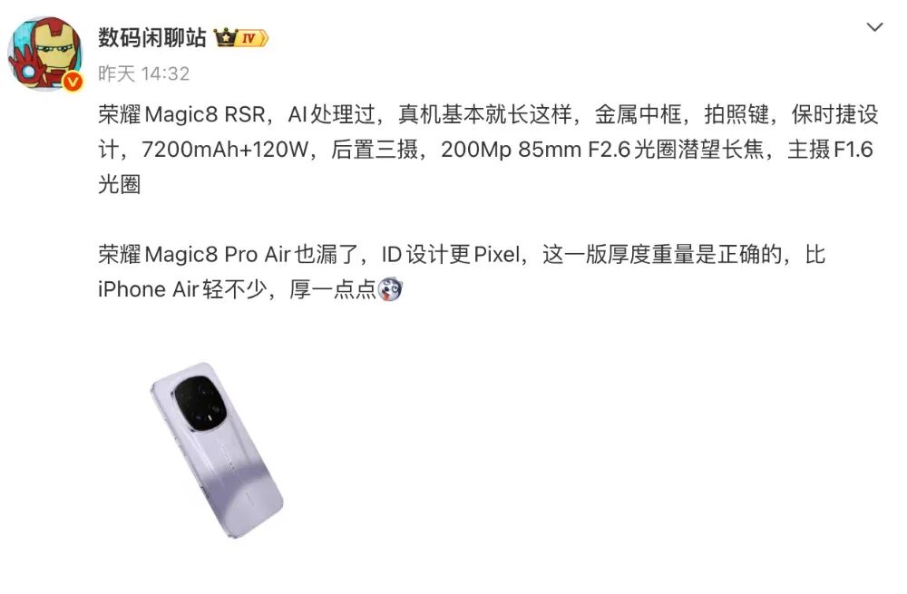 荣耀Magic8 Pro Air也漏了,ID设计更Pixel,这一版厚度重量是正确的,比iPhone Air轻不少,厚一点点
