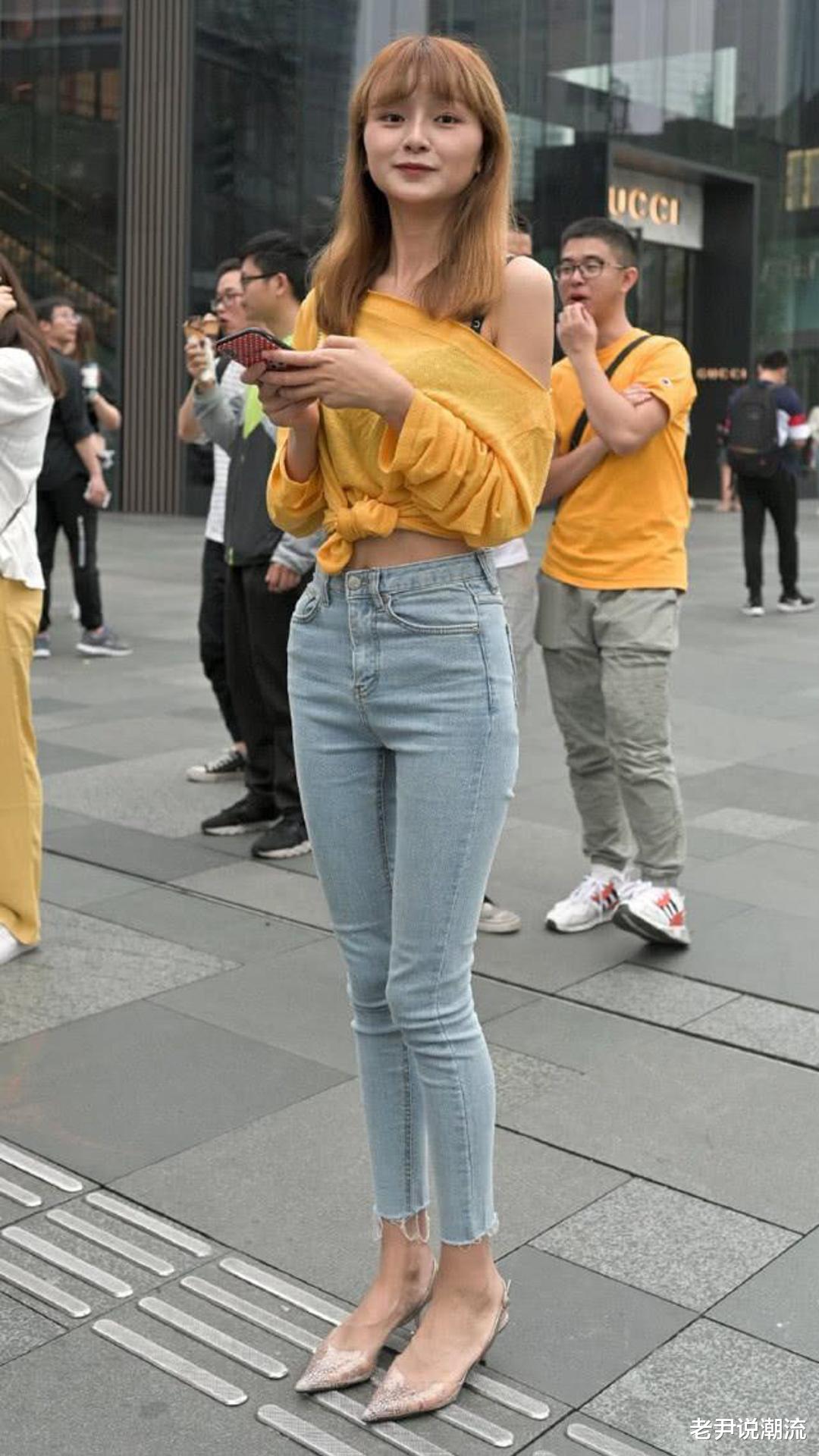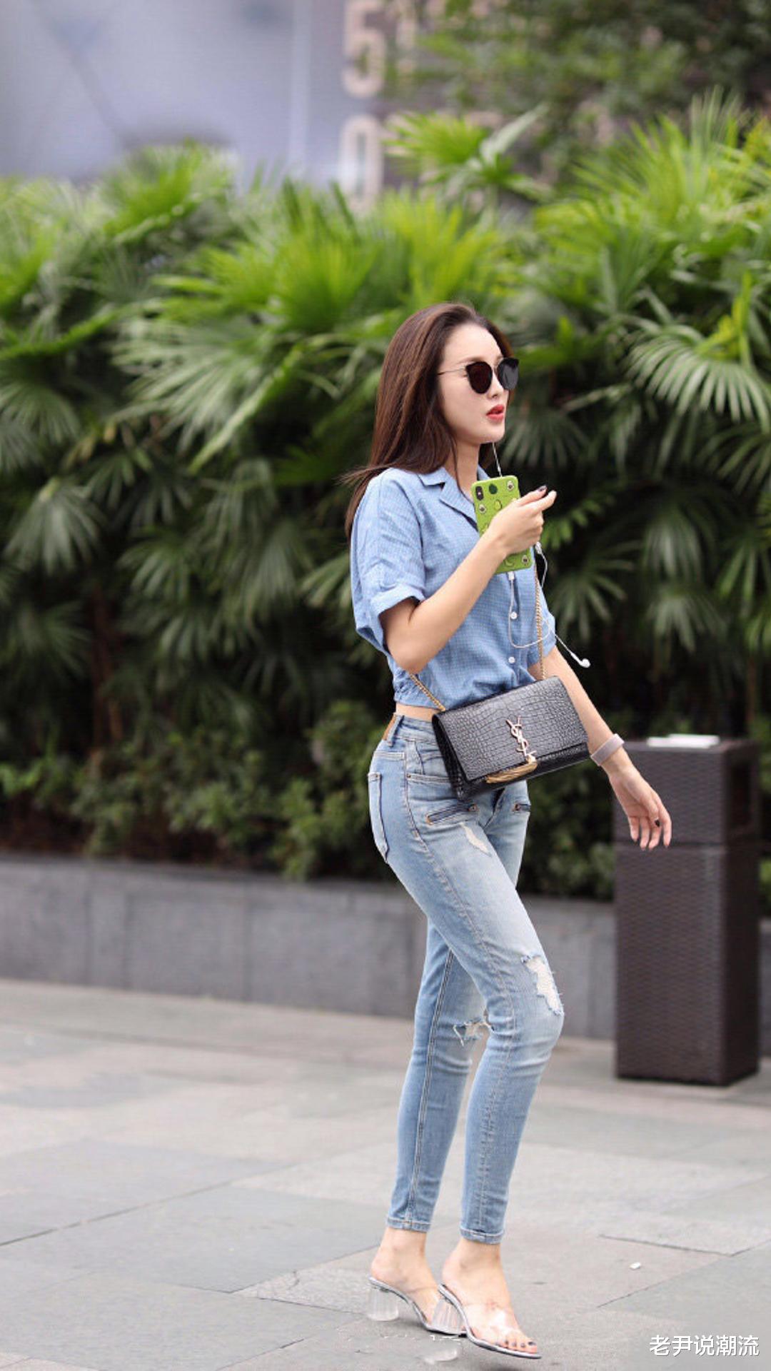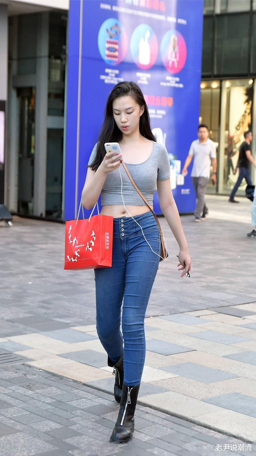 下搭破洞牛仔裤,刻意做旧的毛边与不规则裂痕宛如被时光啃噬的艺术品,粗粝中透着精心设计的美学——膝盖处的破洞若隐若现肌肤,既打破沉闷又强化了随性态度,而高腰设计则与露脐装形成绝妙呼应,进一步拉长腿部比例。