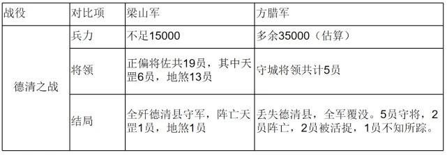 呼延灼作为进攻的一方,不但以一万五千人的弱势兵力攻破约有三万五千人防守的城池,还有余力追杀南逃的司行方败军,逼得司行方溺水而亡。此一战,梁山以阵亡两位头领的代价,攻破德清县城,全歼德清县守军。德清县五位守城将领,阵亡两员,被俘两员,不知所踪一员。