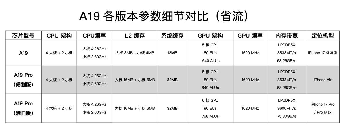 主要差距在于 CPU,A19 的大核缓存为 8MB,小核缓存为 6MB,系统缓存为 12MB。