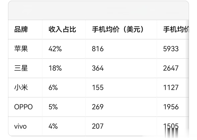 小米在 2025 年第一季度的收入占比为 6%,其手机均价仅为 155 美元(约合人民币 1127 元),是前五大品牌中均价最低的。