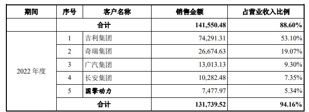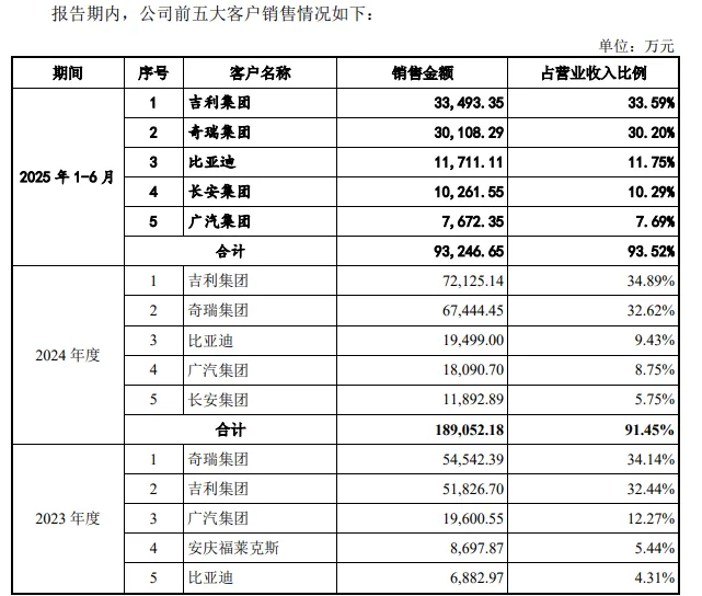 招股书显示,报告期内,丰沃股份前五大客户收入占比均超88%,其中吉利与奇瑞合计贡献近70%营收。
