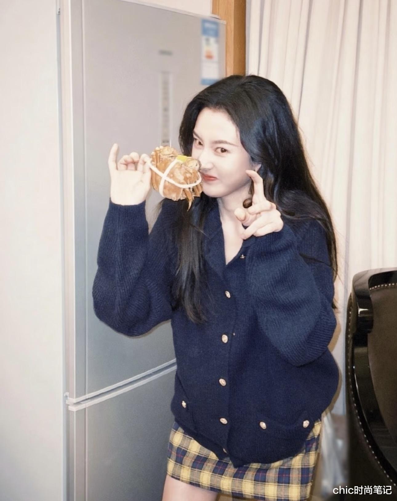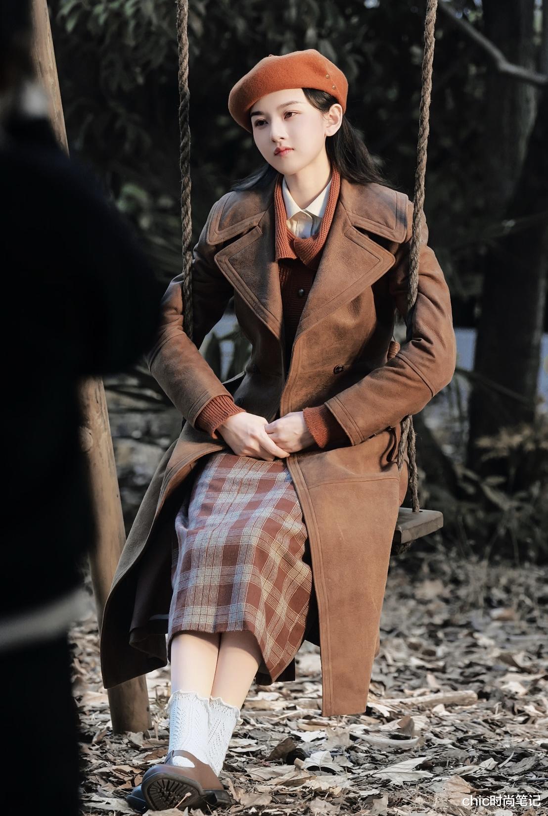 宋祖儿精致的脸庞自带港风复古气质,这种格纹、棕色、橘色等色系与之的适配度极高。棕色麂皮大衣+橘色针织开衫+棕色格纹半身裙+橘色贝雷帽,妥妥的90年代复古女郎~