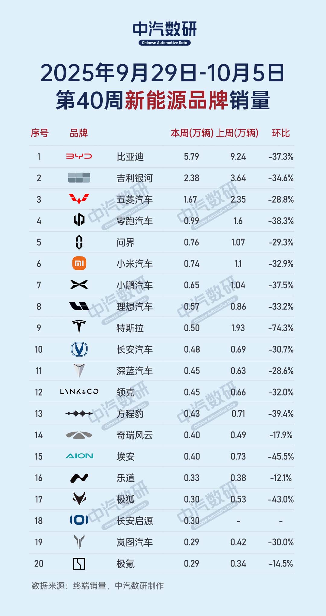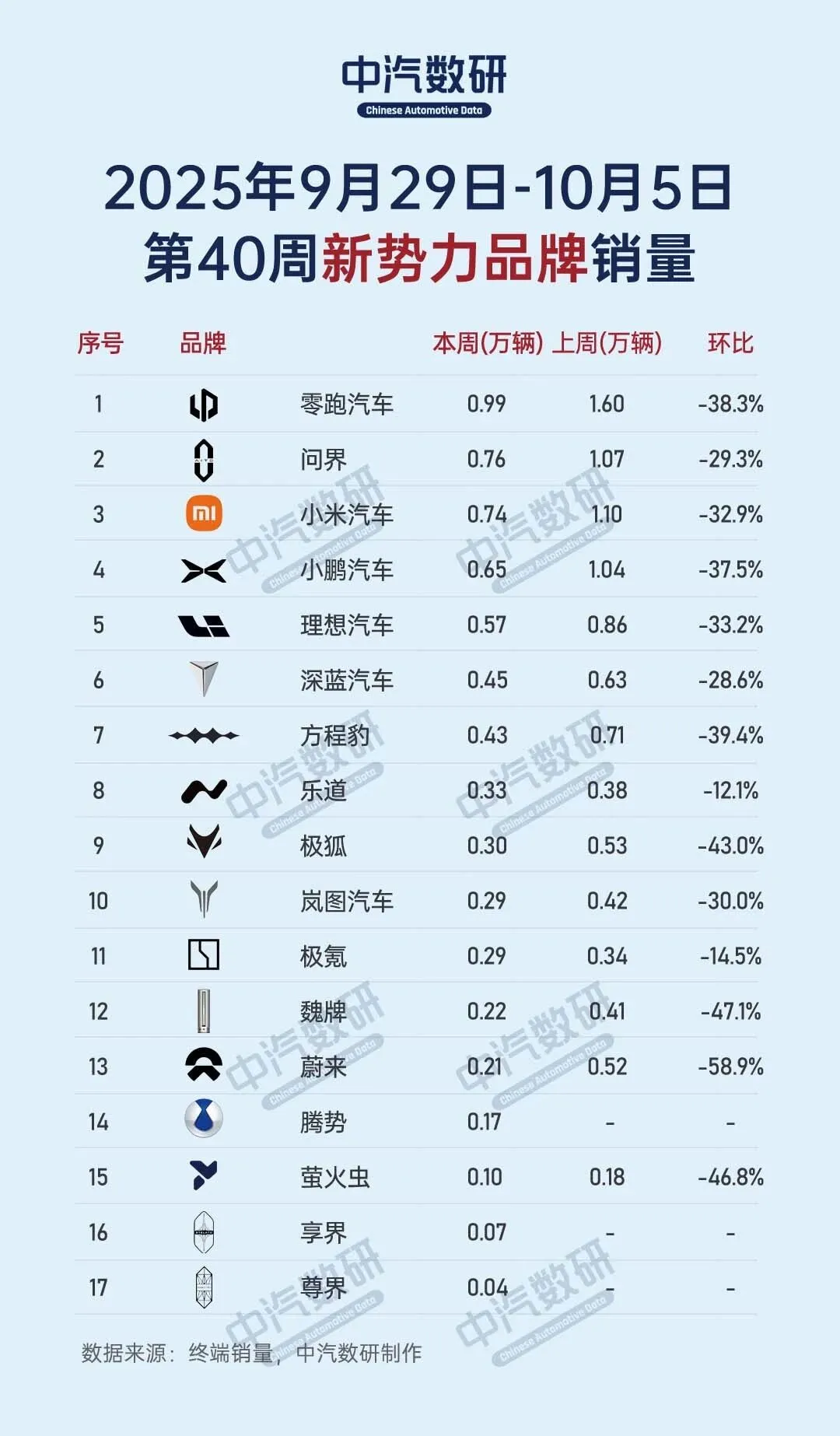 第40周新势力品牌销量榜TOP20出炉,受国庆假期影响,所有品牌环比均出现明显的下滑,TOP10累计销量降低38%以上。