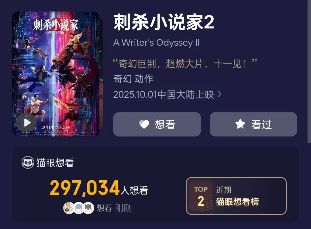 由导演路阳指导,邓超与董子健主演的奇幻动作片《刺杀小说家2》,在猫眼平台的想看人数在国庆档电影中一骑绝尘,位列近期想看榜TOP2。