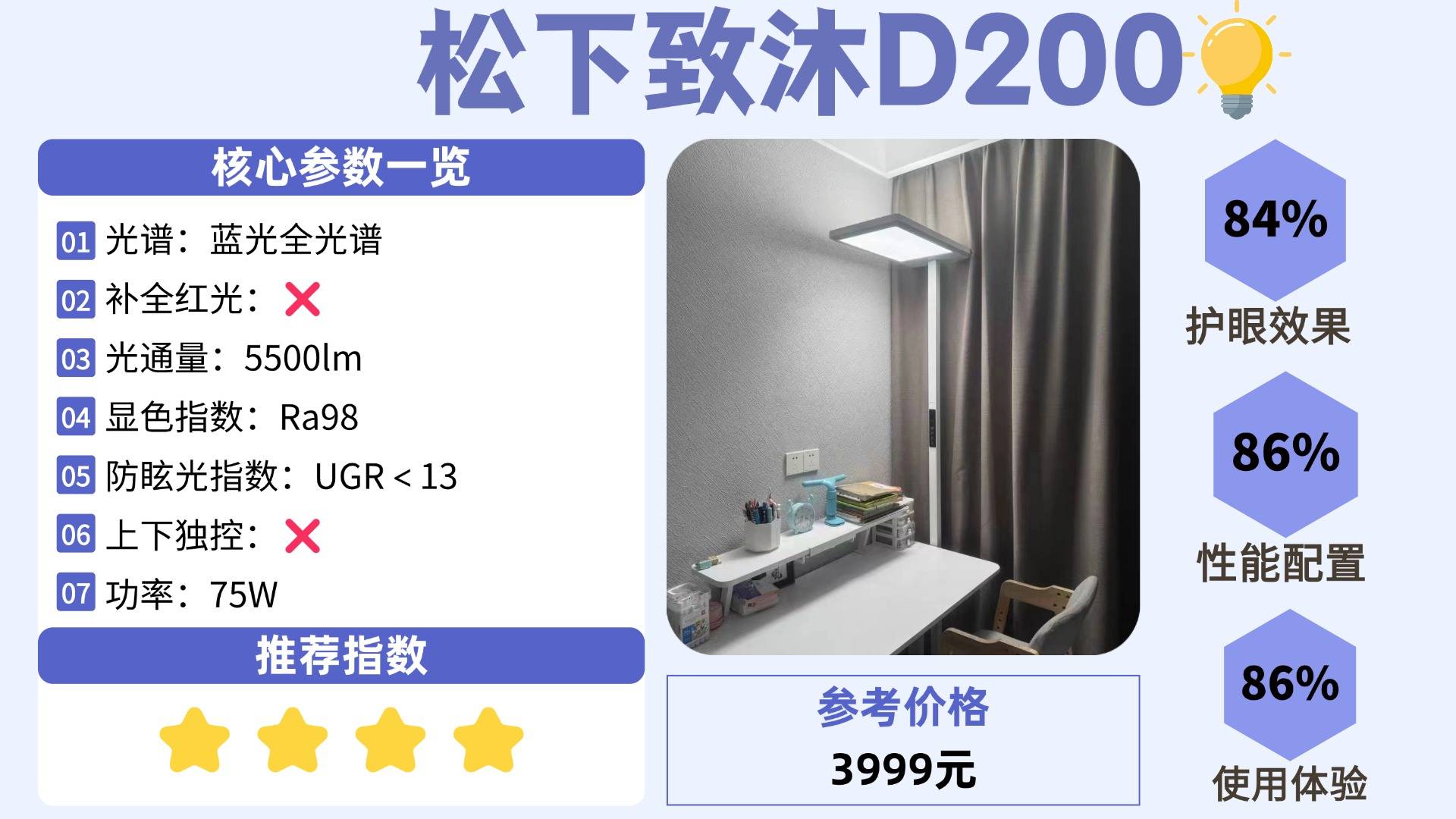 护眼大路灯哪个牌子好用?松下护眼大路灯在光源配置与发光设计上,采用400颗全光谱LED灯珠,搭配一体式发光面以及微菱晶板结构,能够呈现均匀又明亮的光线,能满足10平方米空间的照明需求,功能配置上,松下支持支持上下光源独立调节,同时配备入座感应、无极调光功能,不过需要注意的是,尽管宣称采用全光谱光源技术,但实际测试显示其蓝光峰值约为 1.0,可能存在潜在的蓝光伤害风险。