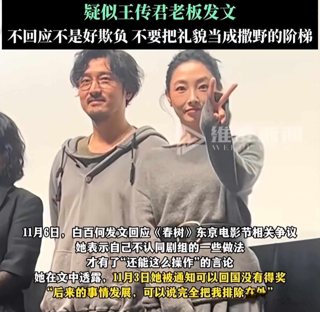 白百何三天没吭声,11月6日才发长文,全文没提王传君,直接把矛头对准了《春树》剧组,说自己是被拉去救场的。