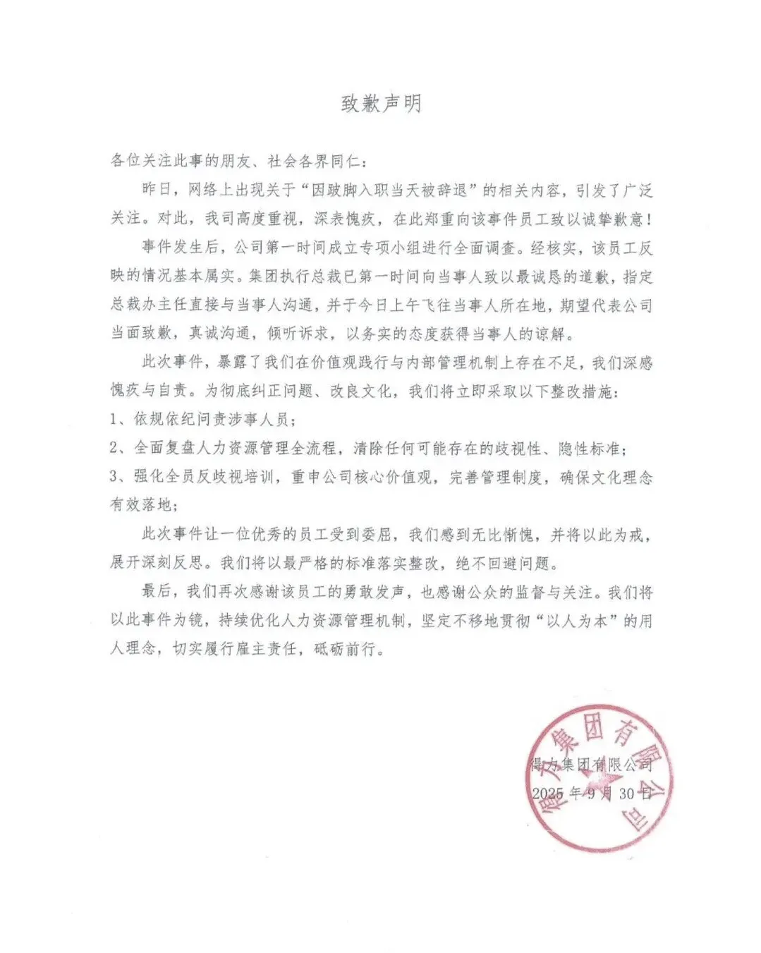 5月13日上午,当事人小钱按录用通知抵达得力集团宁波总部报到,前台拍照录入、工牌制作完毕,却在人事部走廊被一句“你怎么走路有点跛”拦下。