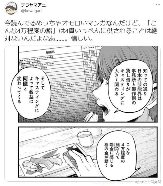 事情是这样的:《【我推的孩子】》中有个桥段,角色在吃一顿价值4万日元的高档寿司。旁白还认真地强调:“演艺圈的消费动不动就是几亿来亿去,这点小钱根本不算什么。”