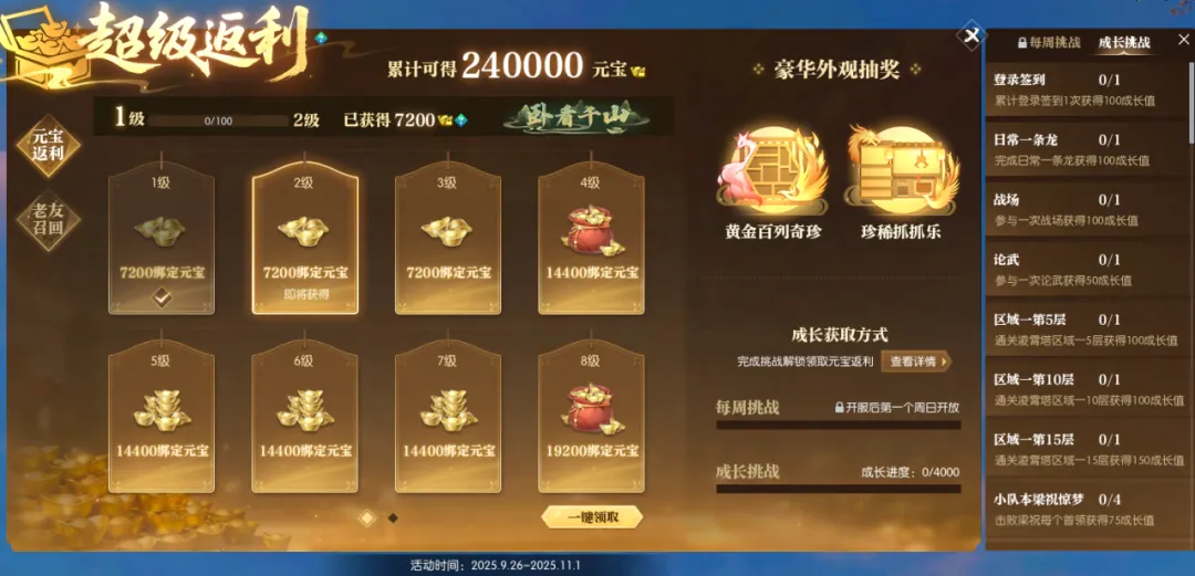 此外,黄金服新服的“返利”机制,亦是促使“刀削面”回归的重要因素。9月26日,《逆水寒》黄金服新服“凤鸣九霄”将采用超级返利模式:只要玩家曾体验过《逆水寒》,便可依据账号历史元宝充值记录与藏宝阁消费金额比例,获得相应数量的绑定元宝返还,单个账号最高返利可达300万。