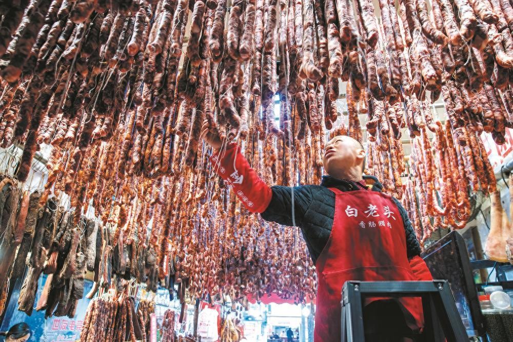 在这条街上经营了20余年的白先生,正忙着为顾客打包香肠。“现在已经进入节前销售高峰,一天最高能卖出去5000多斤,销售额接近20万元。”他笑着介绍。