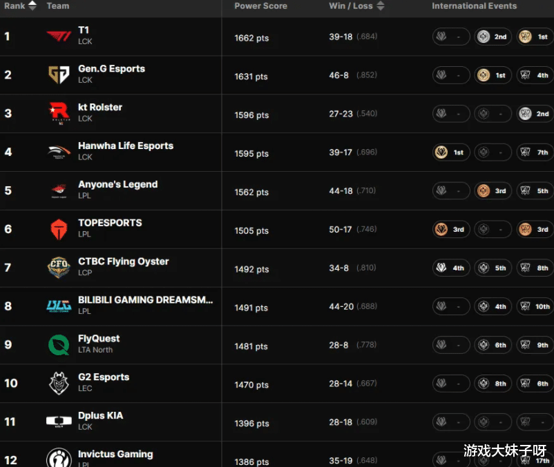 拳头对战队重新排名,BLG德杯垫底淘汰,排名断崖式下跌,拳头公布的2025年全球战力排行榜,其实并不只是一个“名次变化”的问题,而是一次非常直观的赛区实力断层展示,前四名被LCK包揽,本身就已经足够说明问题,更关键的是,这并非靠“偶然爆种”,而是贯穿全年三项国际赛事的系统性压制。