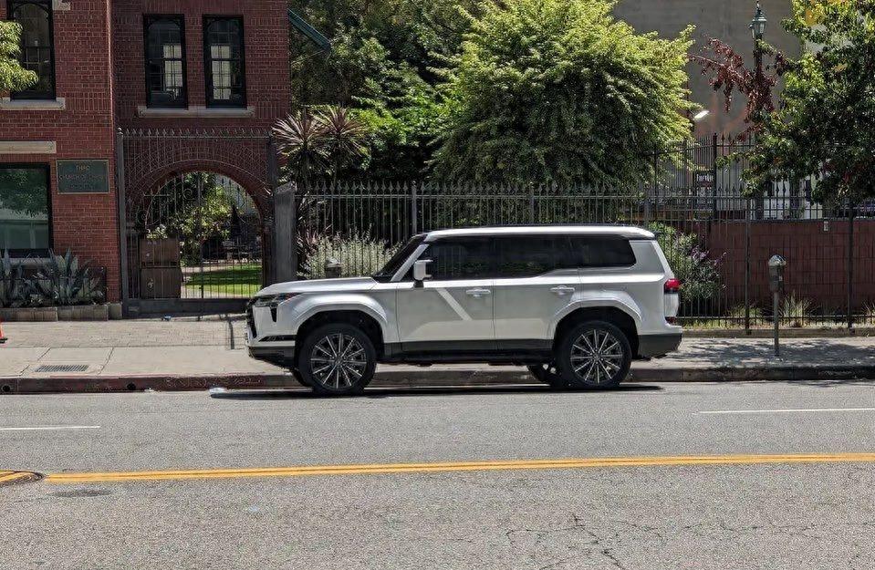 车身侧面,全新雷克萨斯GX整体造型依旧方正硬朗,一条平直的腰线贯穿前后,前后轮眉处采用了外突式的设计,加上侧裙处的硬朗线条以及黑色包围,展现出了极强的力量感与光影效果。细节方面,新车B/C柱、车窗装饰条均采用了黑化处理,而且A柱和D柱的上方还添加了一条细小的黑色装饰条,展现出了一种悬浮式车顶的视觉效果。车身尺寸方面,新车为4950
