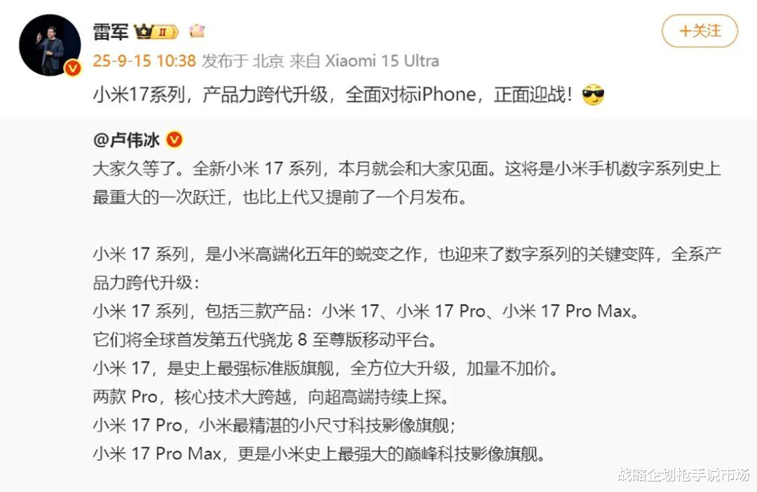 苹果每年9月的秋季发布会堪称科技界的“春晚”,2025年iPhone 17系列如期于9月10日凌晨1点登场,四款机型覆盖5999元至9999元价格带。而小米的应对堪称“教科书级”:9月5日,小米集团总裁卢伟冰提前透露“16系列将提前发布”;9月15日,官宣跳过16代直接命名17系列,并宣布于9月25日召开全球发布会。这种“突然加速”的节奏,直接将小米17系列送入苹果的流量辐射圈。