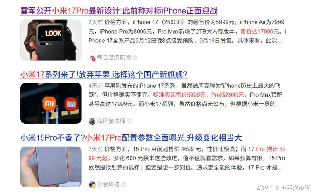 二是流量借势:利用电商搜索规则,让小米17与iPhone 17自然并列,实现低成本心智占领。