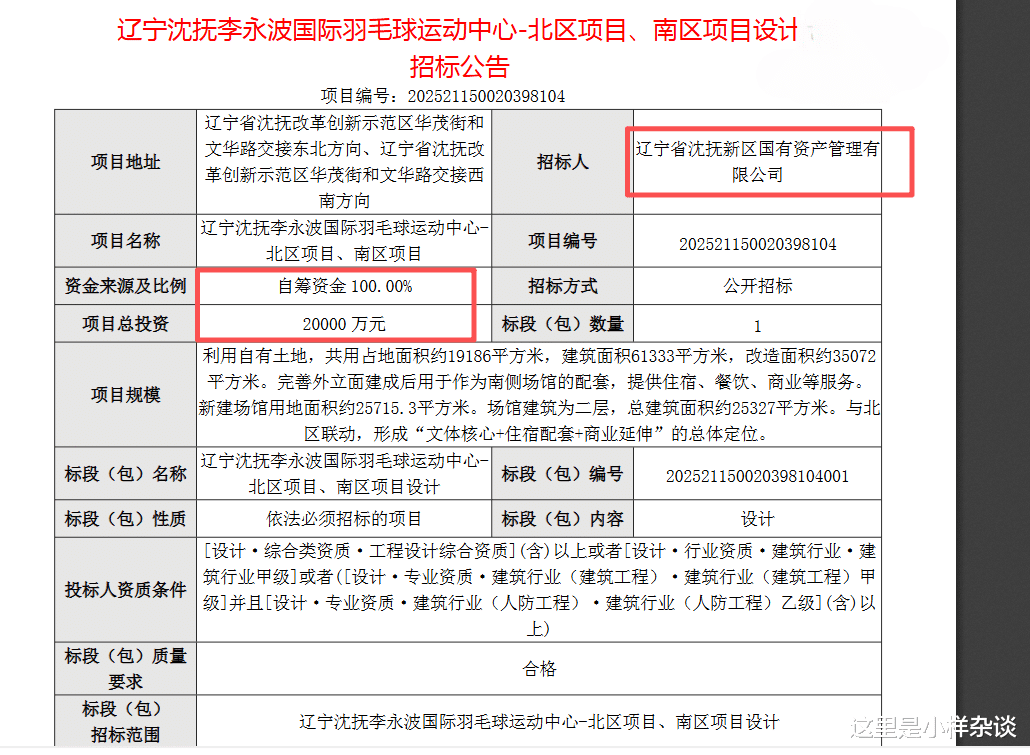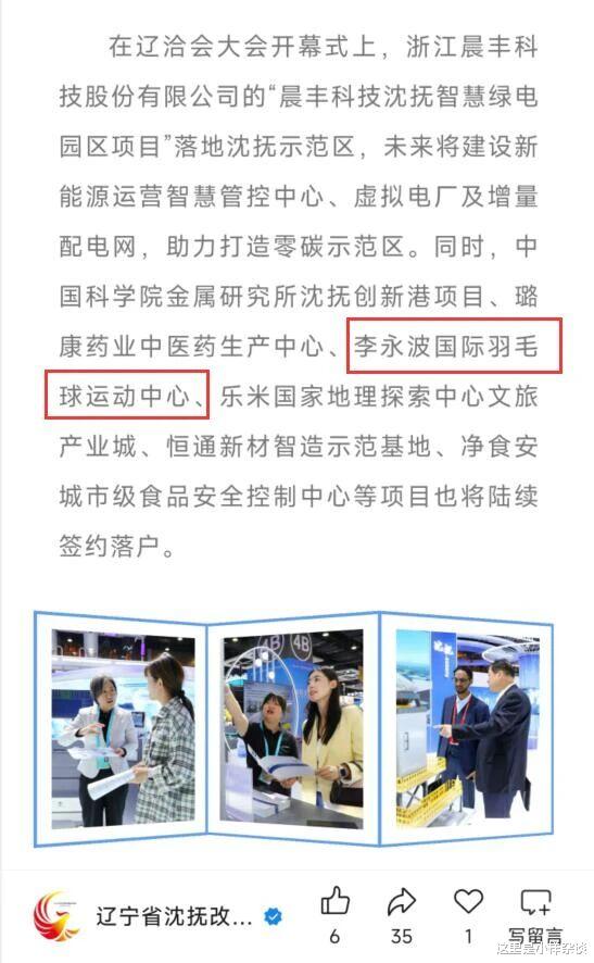 昨天辽宁僧沈抚改革创新示范区官方微信公众号发布了关于辽洽会的消息,提到了即将签约落户沈抚示范区的多个项目,其中就有这个羽毛球训练馆项目,名字叫李永波国际羽毛球运动中心。