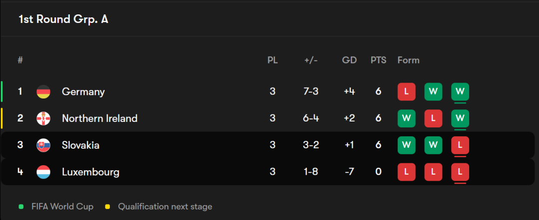 世欧预赛A组四支球队分别是德国、北爱尔兰、斯洛伐克和卢森堡,该组出线争夺非常激烈,前三名球队目前都是2胜1负,他同积6分,德国净胜球最多,排在小组第一,斯洛伐克只有一颗净胜球排在小组第三,但是仍有很大的希望冲击晋级名额。卢森堡三战全负积0分,排名小组垫底,基本已经退出了出线竞争。