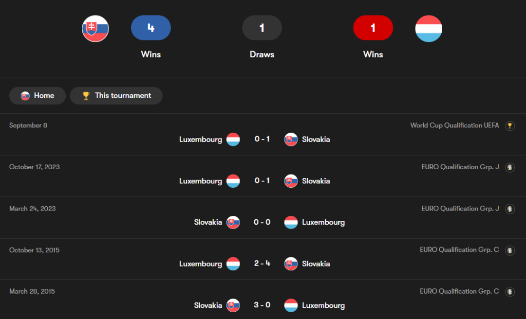 斯洛伐克近5次对阵卢森堡取得4胜1平的不败战绩,占据绝对优势。在主场,斯洛伐克对阵卢森堡的战绩为2胜1平。两队场次交手在今年9月的世预赛,斯洛伐克客场凭借里戈的进球绝杀对手。