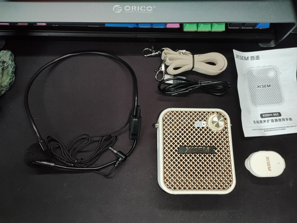 西圣XISEM-BEE小蜜蜂扩音器的配件比较丰富,除了产品标配的充电线与说明书以外,还附带了一套有线耳麦和无线的麦克风,另外扩音器还配备了肩背的肩带。