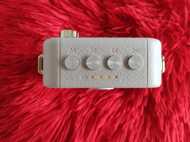 西圣XISEM-BEE小蜜蜂扩音器的控制按键由正面的开关机按键和位于产品的顶部边栏的四枚功能键组成,正面的开关健按压为开关机,旋转为音量加减按键。顶部为功能切换、前后选曲、和播放按键,按键采用了CD纹装饰,并在上方设有刻压的标识, 可以只通过触感就加以区分,完全可以盲控。按键下方设置了四枚电量指示灯。