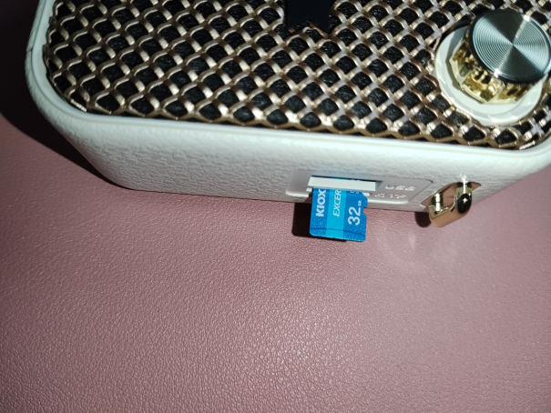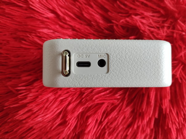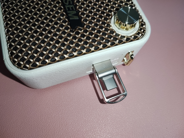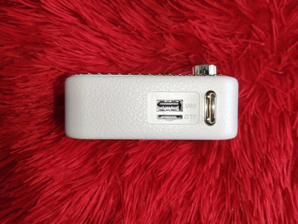 扩音器的一侧设置了充电和有线耳麦接口,另一侧为USB和TF卡扩展接口。两侧还放置了金色肩带的连接口。