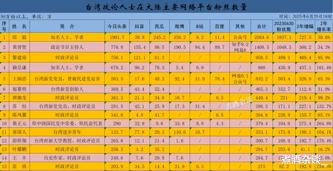 天,我再次观察记录了台湾主要政论人士在大陆各大网络平台的粉丝数量情况。2024年,因为一些情况,粉丝数量变化情况没有及时录入。因此,这次观察增幅增速,对比的是两年之前2023年6月底的数据。