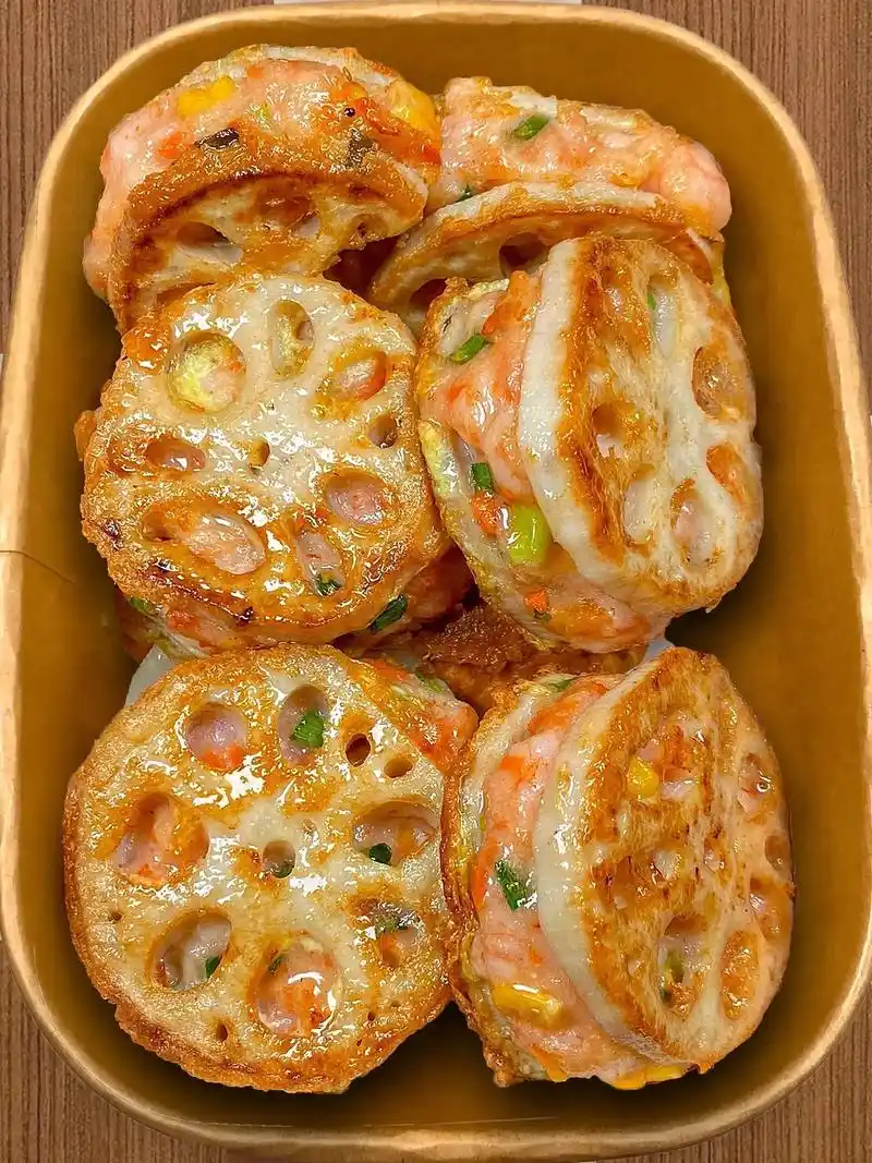 再裹上面糊,放进热油里炸,噼里啪啦,就像在开小派对。不一会儿,金黄色的藕夹虾滑就做好啦,咬一口,外酥里嫩,虾滑Q弹,简直太棒了!就算是厨房小白也能轻松搞定,快来试试吧,让你的餐桌增添一道美味佳肴,保准家人朋友都夸你厨艺棒哦!