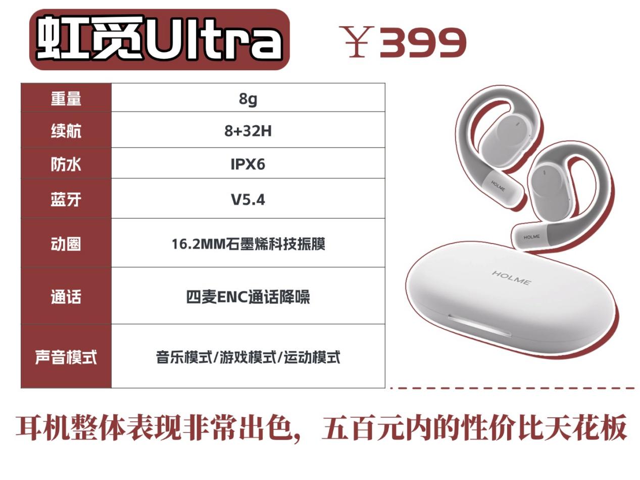 总结:如果想花少钱买个好用的,虹觅 Ultra 绝对是首选。399 元的价格,佩戴舒服、音质不输给贵的款式、防漏音给力,续航和防水也够用,不管是日常通勤、上班用,还是学生党在宿舍用,都很合适,性价比拉满,预算有限的朋友可以直接冲。
