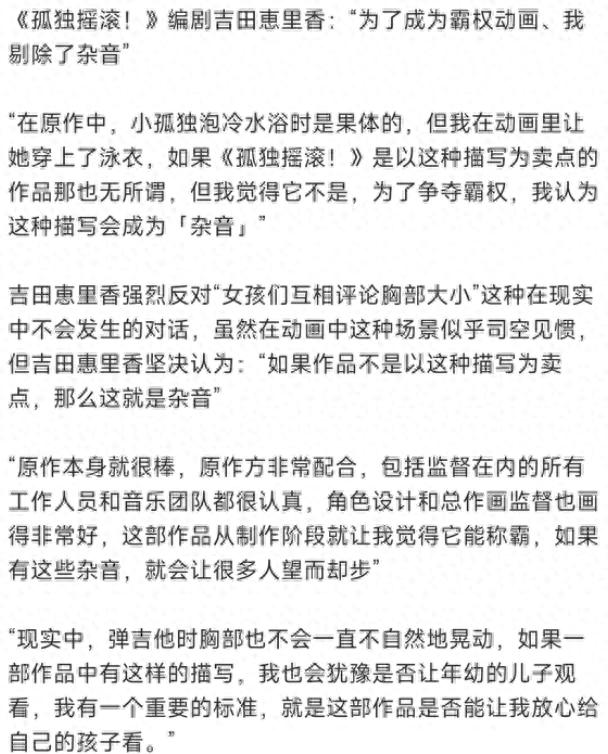 当然,今天不是来聊《孤独摇滚》好不好的,而是吉田惠里香(《孤独摇滚》的编剧)发表了一段言论,然后直接被炎上了。她直接把“如果作品不是以这种描写为卖点的话,那么这就是杂音了”,这句话给了说了出来,等于就是说《孤独摇滚》之所以红也是因为自己在文案上把控得好。