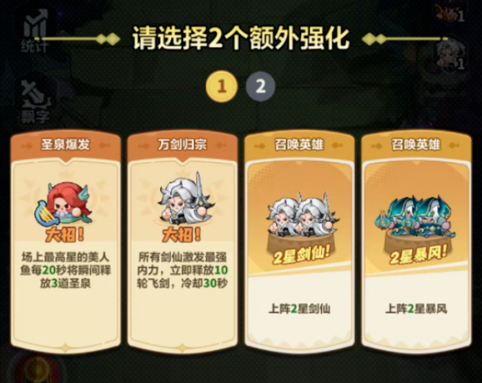 :战斗开始时,系统会随机提供 2 组额外强化词条,每组 4 个,可任选其中 2 个。优先选择输出英雄的 “上阵二星” 词条,避免过早选择辅助或控制英雄的词条。例如,争取达成 2 星主 C 和 6 主 C 词条的完美开局,即开局强化词条阶段拿 4 个主 C 词条,再用 300 金币强化 2 次拿 2 个主 C 词条,加上火刀或硬币装免费召唤 2 次合成 2 星主 C。关卡技巧