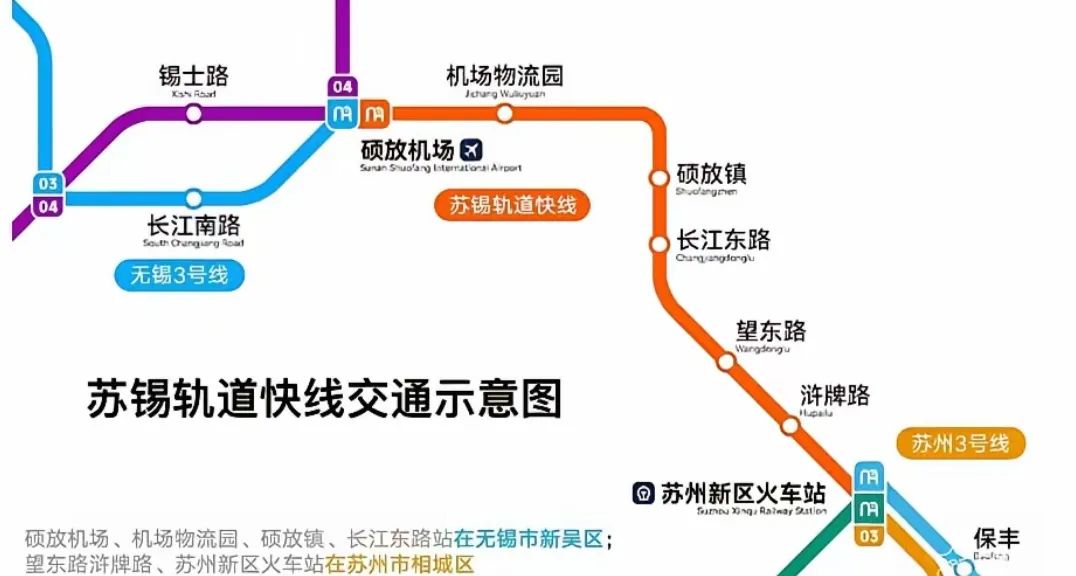 苏锡轨道快线是一条规划的地铁线路,连接无锡地铁3号线和苏州地铁3号线,硕放机场站至苏州新区火车站段,历经6个站点,长约17千米,目前运营有苏锡公交1号线可以实现两地互通。