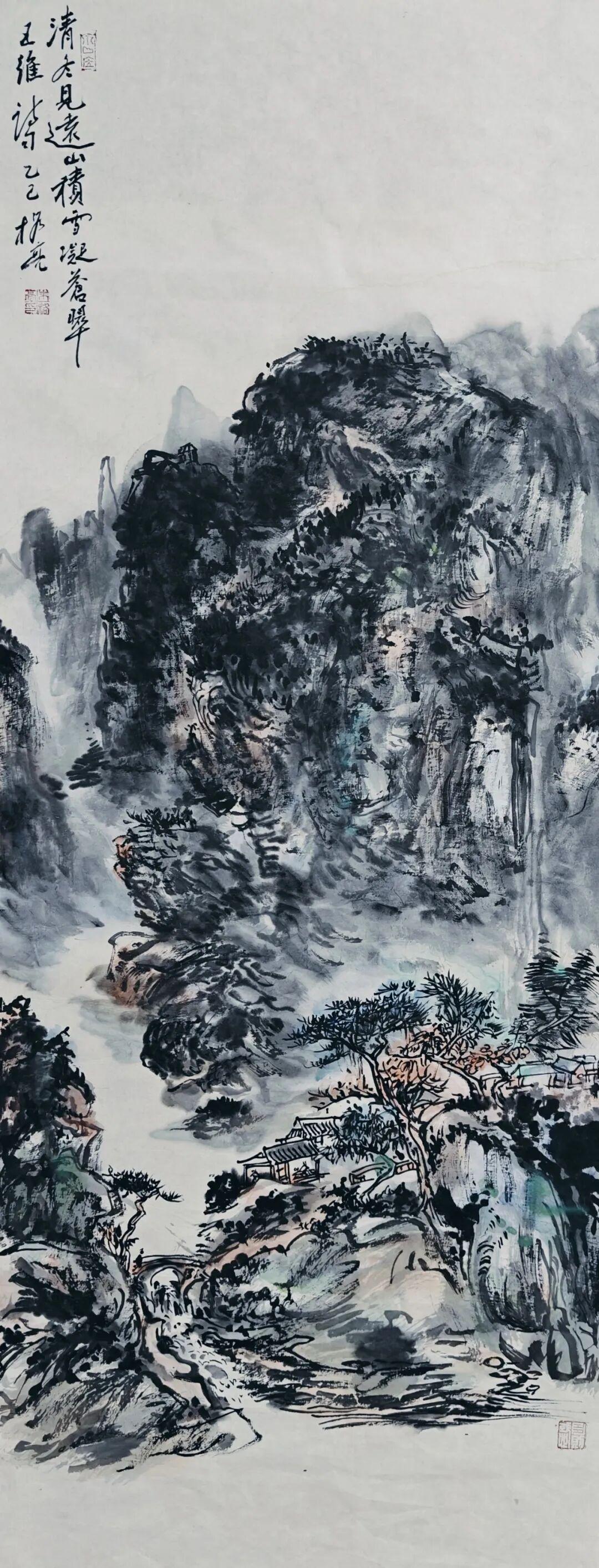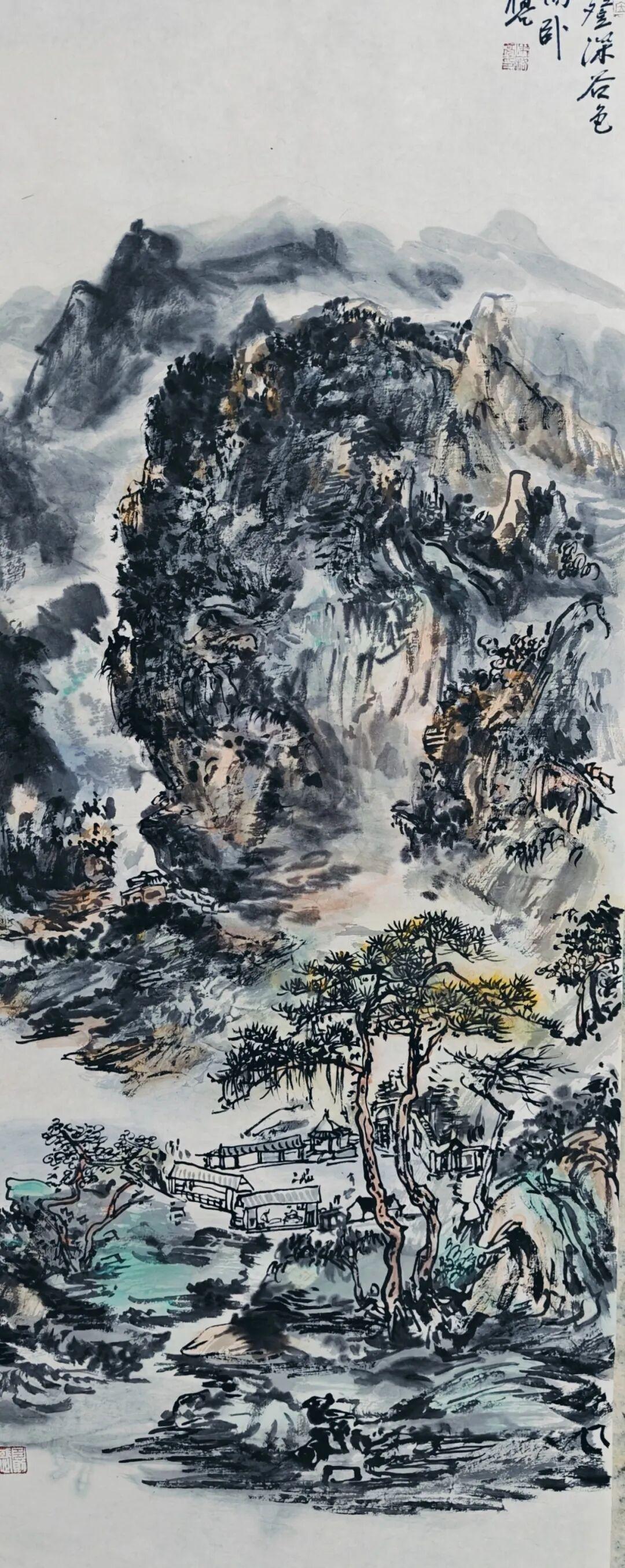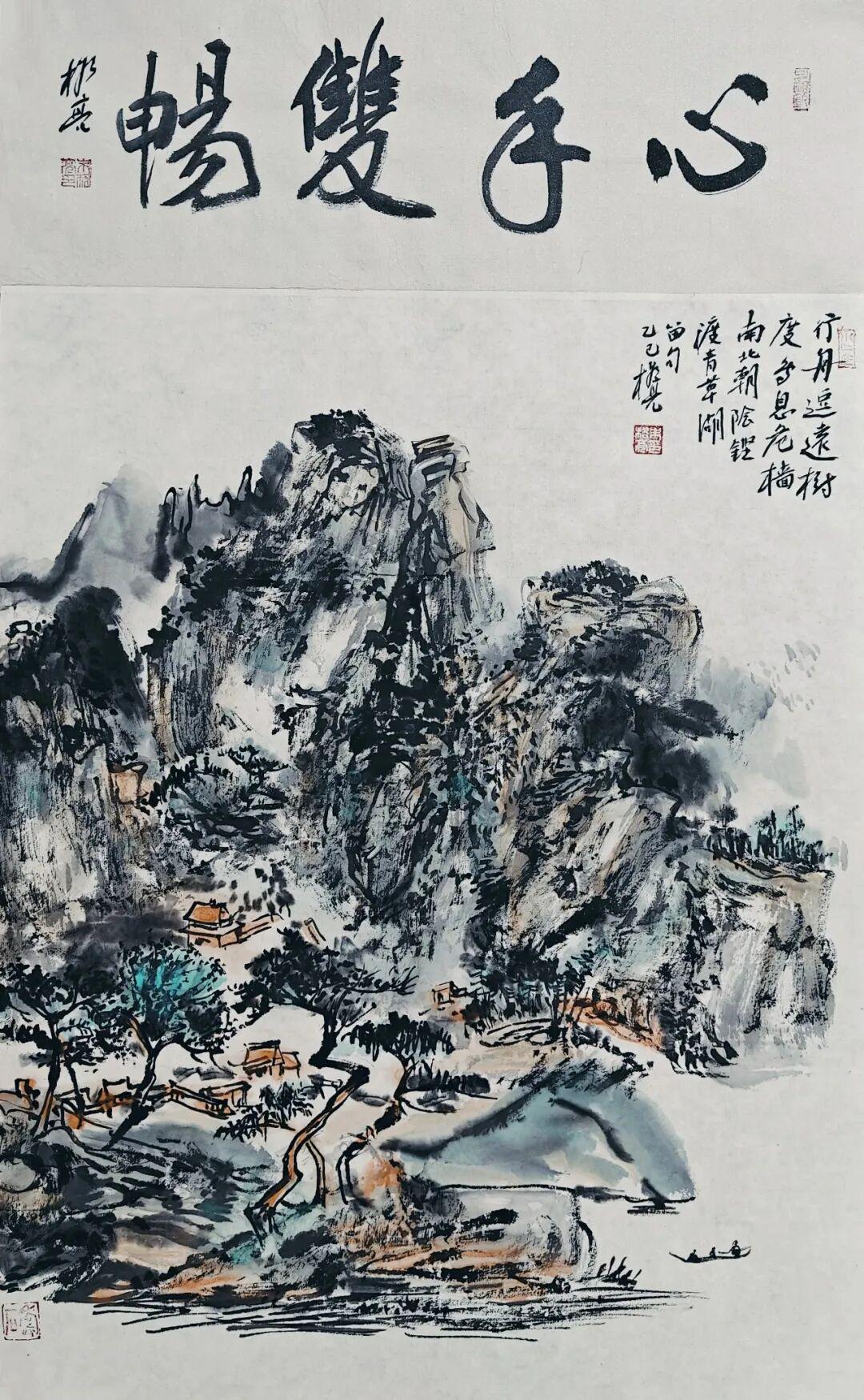 与此同时,一幅优秀的山水画作,必然也是离不开画家所营构的意境。细品朱格亮先生的山水画境,可见他的画中是从不缺乏动人心弦的意蕴。纵观诸幅画作,常见青岫层叠、峦影深远,山涧之间云水蒸腾而上,又有隐逸民居静立其间,青石台阶蜿蜒逶迤。远山染红绯,近峦含葱翠,随即生发出一派素雅清旷之气。再加上朱格亮先生常以诗句点题,如“我言秋日胜春朝”、“横看成岭侧成峰”、“青山一道同云雨,明月何曾是两乡”等,诗情与画境相映,山水共文章同辉。此情此景,观之真令人神思摇曳,心向往之!以山水抱朴守真,借笔墨绘就胸臆。在这素纸之上,展露的不仅只是峰峦云水,更是朱格亮先生的内心情致与文化涵养!一山一水、一诗一景,终是臻于澄怀之境,是谓深谙画道真谛也!