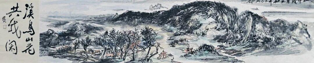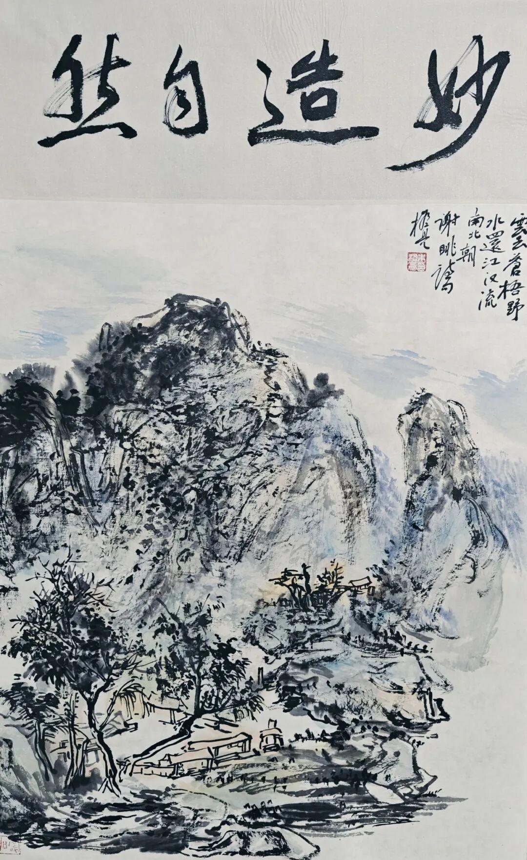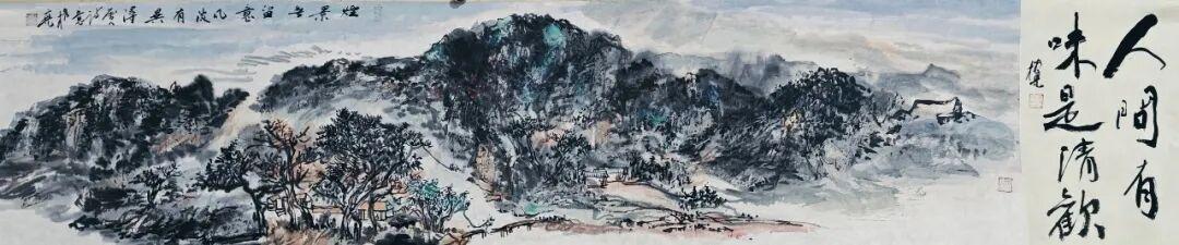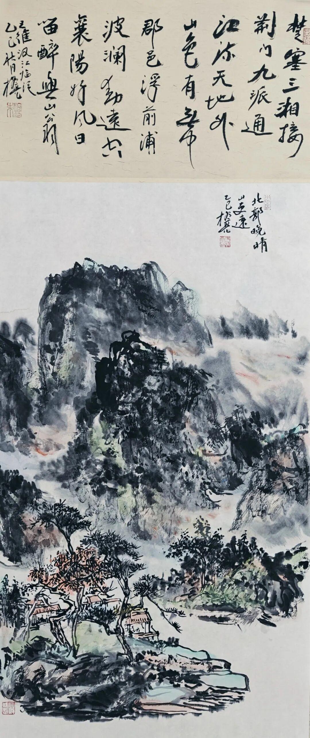与此同时,一幅优秀的山水画作,必然也是离不开画家所营构的意境。细品朱格亮先生的山水画境,可见他的画中是从不缺乏动人心弦的意蕴。纵观诸幅画作,常见青岫层叠、峦影深远,山涧之间云水蒸腾而上,又有隐逸民居静立其间,青石台阶蜿蜒逶迤。远山染红绯,近峦含葱翠,随即生发出一派素雅清旷之气。再加上朱格亮先生常以诗句点题,如“我言秋日胜春朝”、“横看成岭侧成峰”、“青山一道同云雨,明月何曾是两乡”等,诗情与画境相映,山水共文章同辉。此情此景,观之真令人神思摇曳,心向往之!以山水抱朴守真,借笔墨绘就胸臆。在这素纸之上,展露的不仅只是峰峦云水,更是朱格亮先生的内心情致与文化涵养!一山一水、一诗一景,终是臻于澄怀之境,是谓深谙画道真谛也!
