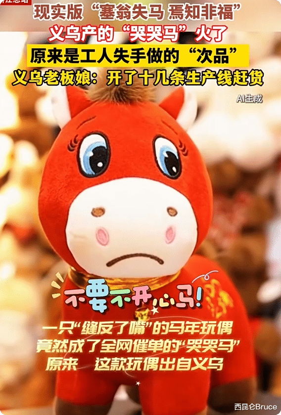 马年公仔“哭哭马”的诞生源于一次工人失误。一名杭州网友收到网购的马年公仔后,发现其中一只的嘴巴被缝反了。购买者原本想向商家反馈问题,却在社交平台分享后意外引发关注。
