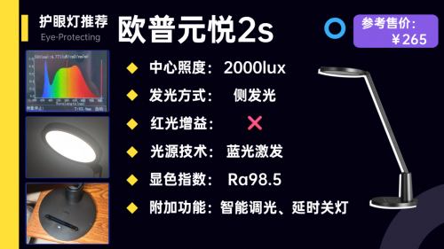 小孩护眼灯怎么选择?可以选择欧普元悦2s,它整体来说是一款偏向基础照明的台灯。光线上它是采用了63颗LED灯珠结合侧发光的设计,光线经过了导光板和扩散板处理,整体比较柔和。同时光线色温为固定的3900K,属于中性光的区间,能兼顾清晰度和舒适度,日常读写够用。不过它在距离中心照明区域50cm处的均匀度是2.62,书桌可能会存在暗角。而且它采用的是蓝光激发全光谱技术,430nm左右有一个尖锐的蓝光峰值达到了1.0,整体来说护眼效果还是一般。