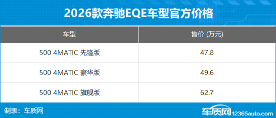 11月26日,车质网从官方获悉,2026款奔驰EQE正式上市,此次共推出3款车型,售价47.8-62.7万元。作为年度改款车型,新车主要针对功能配置进行升级,动力上全系搭载双电机四驱系统。
