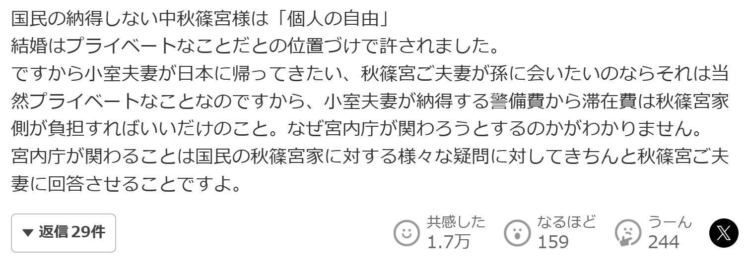 “如果小室夫妇想回日本,秋篠宫夫妇想见孙辈,这本就是理所当然的私人事务。只要秋篠宫家承担小室夫妇认可的安保费及居留费即可。
