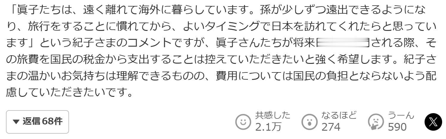 对此,我强烈希望未来真子她们访日时,其旅费能避免使用国民税金支付。虽然理解纪子妃的温暖心意,但希望在费用方面能避免给国民造成负担。”